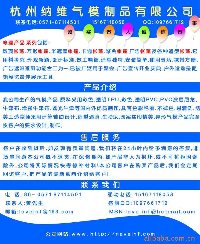 杭州纳维气模制品有限公司是一家国内集研发、生产、销售为一体的专业化企业拥有一批精湛的研发设计人员、专业的生产技工,并采用电脑辅助设计,制作产品已远销国内市场。主要产品有各种舞台灯光装饰气模,PVC印字升空气球、落地球、拱门、帐篷、卡通系列、攀岩系列、空中舞星系列、灯笼柱、充气仿真系列、大型充气娱乐城系列、大型水上游乐系列、圣诞节活动系列等。