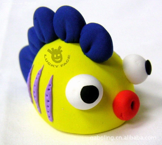 ⒉色彩艳丽、纯正,并且可以象水彩那样随意的调颜色。不同色彩的泥放在一起稍加捏揉就可以变成第三种颜色,使得捏出来的作品颜色更丰富。