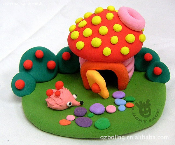⒋既可以重复使用,也可以把作品永久保留的一种材料。如果对做成的成品不喜欢,就可以用塑料薄膜把泥包起来保存,下次再使用,如果觉得自己的作品很满意,那就放置在空气中自然放干,干燥后不会变形、不会变质、开裂、褪色,性能及其稳定,干燥以后还可以在上面写字的!!!而橡皮泥因为是面泥,所以作品干燥后,会开裂变形、发霉、变质,再成功的作品也不能长久的保留起来;