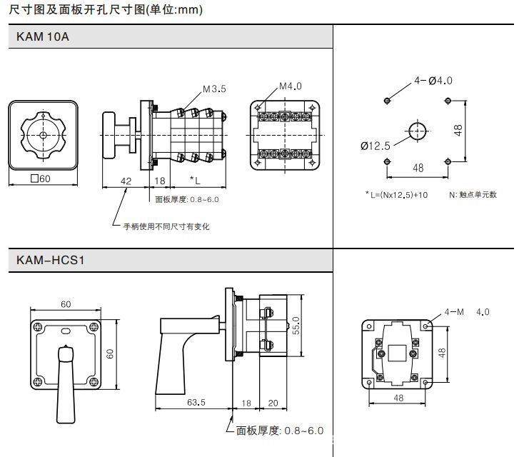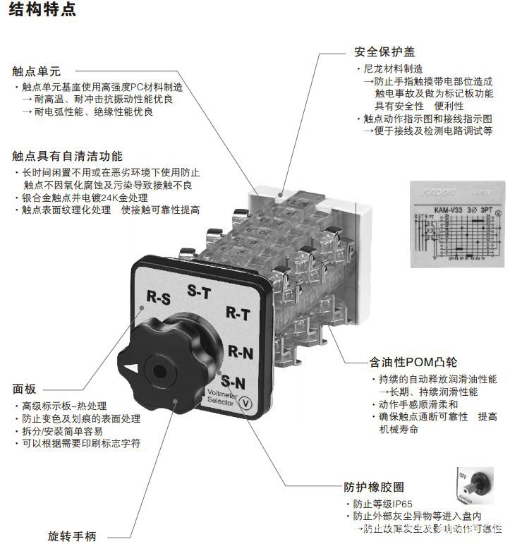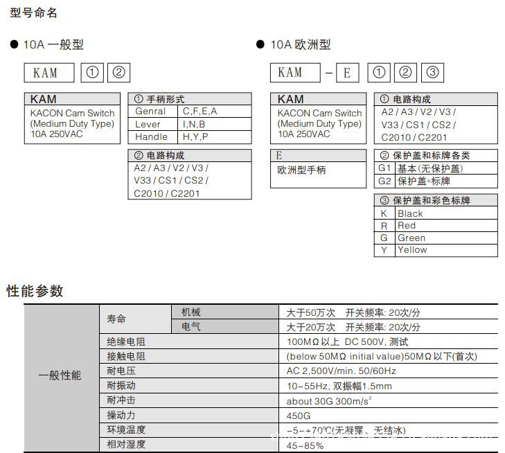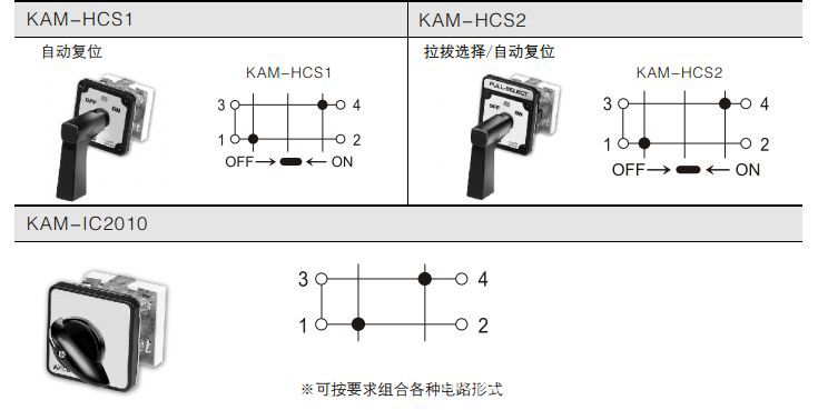 KAM/KAH凸轮开关通过增减触点层数、改变动作角度和档数、设置复位和不复位功能从而组合出数千种规格,可以按照要求定制触点形式、操作手柄款式和颜色、标志字符印刷,作为万能转换开关、主控开关,启动开关等全面的多适应性用途。