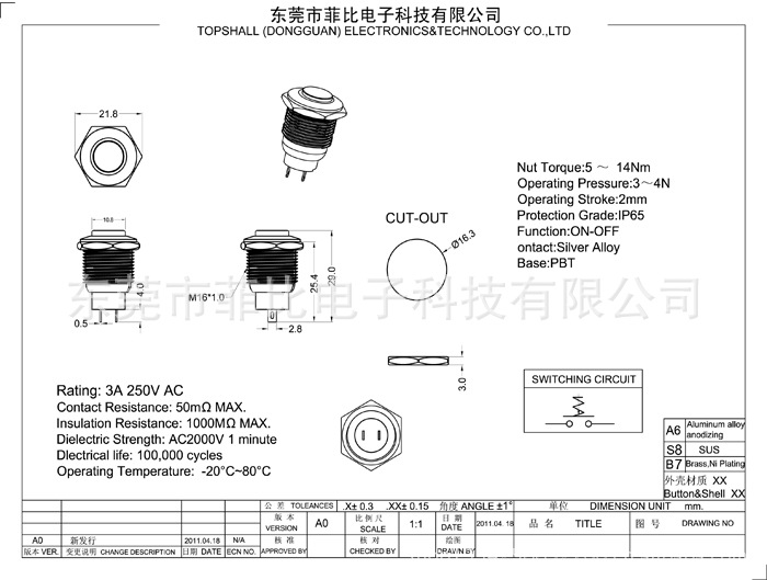 本开关属于中高端产品,采用优质的进口原金属材料经高速CNC和相关生产部门对质量的严格管控加制而成。具有IP67防水,防尘,防爆和高抗破坏之功能,产品的外型及表面精美,按键的手感很好,功能完善。在此系列开关是最短的。其按键,灯,端子的详细分类描述如下列各项: