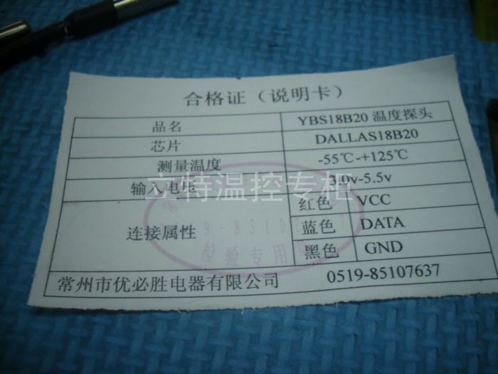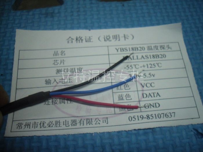 输出引线:红色(),黄色(DATA),蓝色(GND)采用美国Dallas 半导体公司的数字化温度传感器DS18B20,采用导热性高的密封胶灌封,保证了温度传感器的高灵敏性,极小的温度延迟。该温度传感器支持“一线总线”接口(1-Wire),测量温度范围为 -55°C~+125°C,在-10~+85°C范围内,精度为 ±0.5°C。现场温度直接以“一线总线”的数字方式传输,大大提高了系统的抗干扰性。适合于恶劣环境的现场温度测量。DS18B20数字温度传感器都具有唯一的编号,温度采集设备通过编号来识别对应的温度传感器。传感器的引线长度可根据用户需要定制。