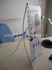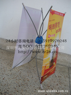 X型展示架:我们常常简称"X展架"或"X架"属于常规展示架,之所以将其定义为X展架,是因为其支撑画面骨架从侧面看是"X"形,它最为实用的尺寸有宽60cm*高160cm;宽80cm*高180cm;这是X架画面整体展开后的尺寸,画面制作工艺为写真或者丝印,材料为PVC,如果制作数量巨大就可以选折丝印画面,这样画面效果更为逼真,更富有质感,画面颜色跟先前设计原稿的偏差极小,其画面和架子可单独拆装,配有包装袋,便于携带,和H架一样适合户外展览展示,广告促销等.支架一样也有各种各样的样式和型号,客户根据自身需求选择适合自己的支架(其画面材质和制作工艺都是一样的),档次越高,材质越好当然x架的价位越高. X展架又分为: 经济型X展架,一把抓X展架,韩式X展架,铁管X展架,防风型X展架,铝质X展架,全铝X展架,灵智型X展架,大韩式X展架,联体X架,三脚撑X展架,齿轮X展架,可调节X展架,桌面X展架等。