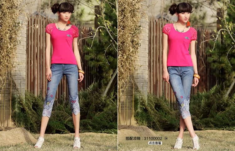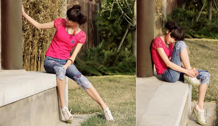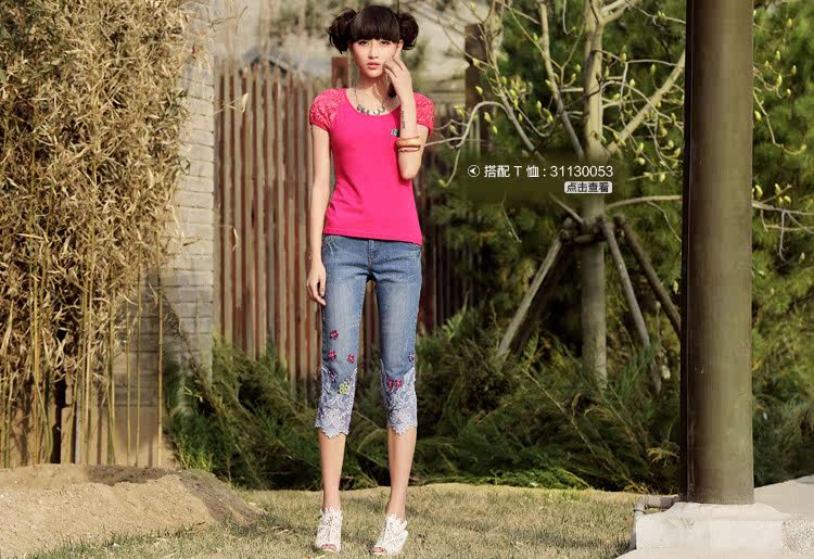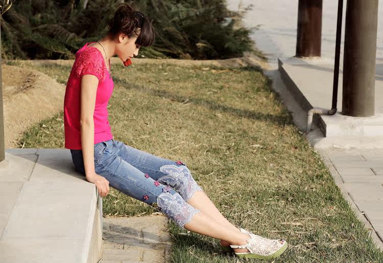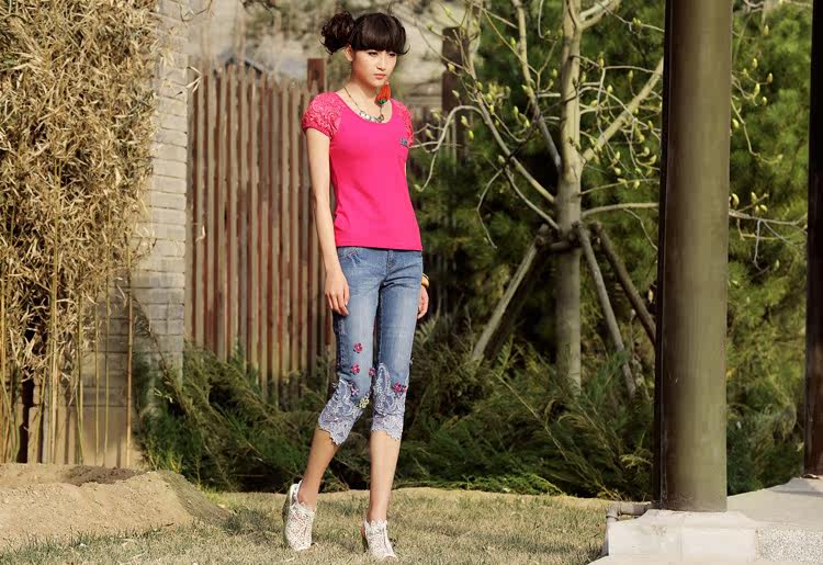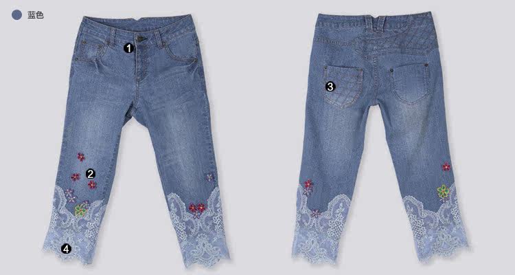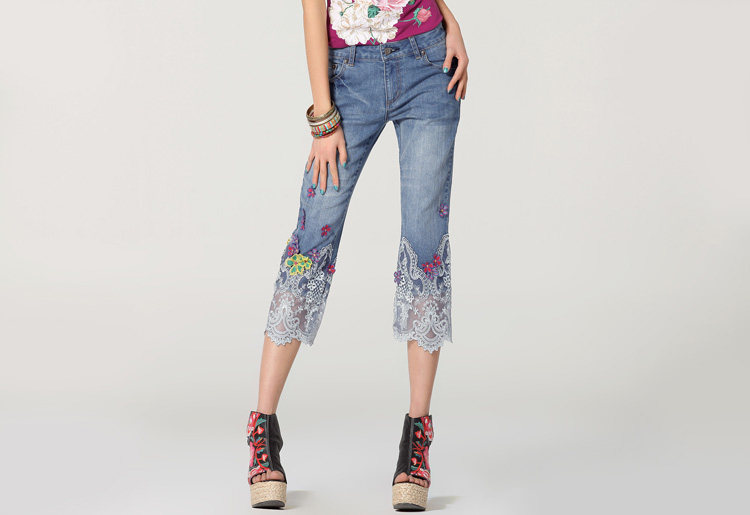 裂帛同款民族风女装新款夏裤绣花磨白七分牛仔裤女32170059 拂瓣