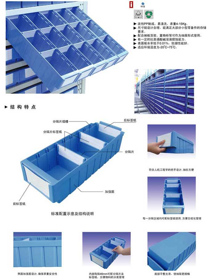 零件盒物料管理中最基本的单元容器,其功能化的设计和灵活多样的应用,使得物料库存管理和作业现场管理更加有序、高效,是5S管理的有效工具。抽屉式零件盒采用改性PP为原材料注塑加工而成;具有机械强度高。抽屉式零件盒广泛应用于加工、装配、检测、维修等工位(和工作桌、物料整理架、置物柜、工位推车等其他物流设备配合使用),存放轻、小型零部件;也适用于保管多品种、轻小型物料的仓库(在仓库、车间配合货架和垂直升降库一起使用,还可以自身组立来储存物品)。按照不同的功能可分为:组立零件盒、背挂零件盒、抽取式零件盒。本公司专业生产抽屉式零件柜、文件柜产品,适合于搬运、存放各类模具、刀具、夹具、五金零件、机械配件、电子元件及各设计图纸(A4等)、单据、文件、资料等。公司现有10屉、12屉、20屉、24屉、 30屉、40屉、48屉、75屉、40屉带门锁、 48屉门锁、75屉带门锁 共十一款抽屉式零件柜。