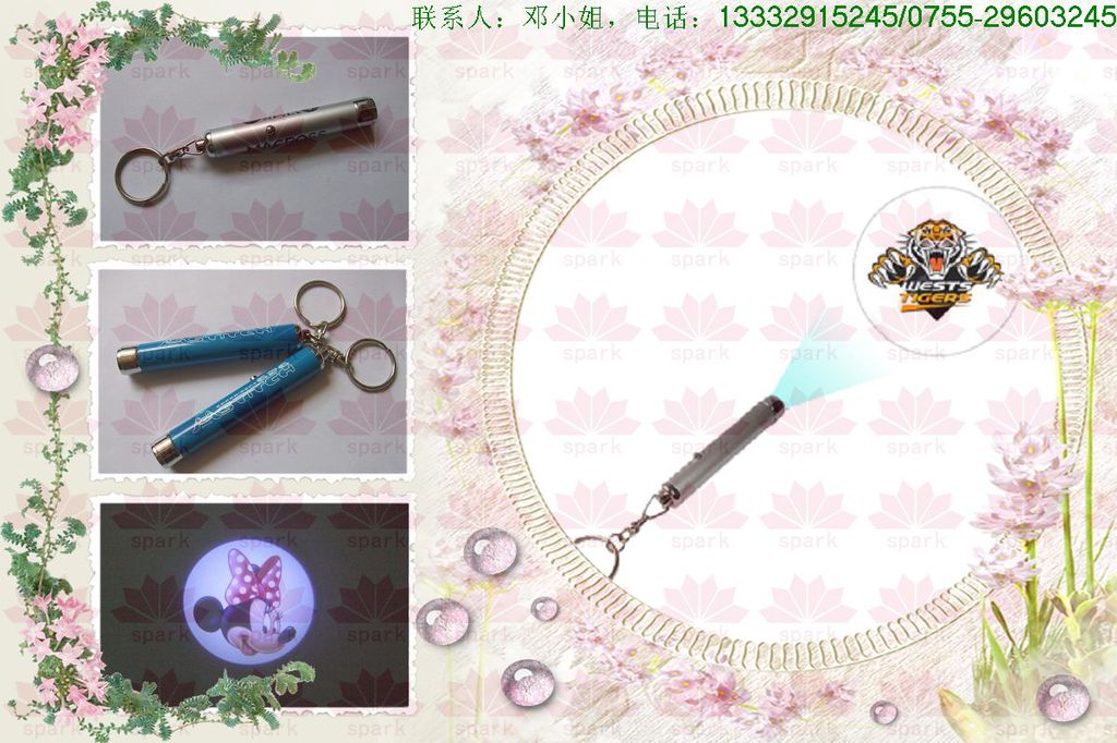 产品特色:此款手电筒用最新颖的方式将广告LOGO或图案做成,用光源\凹凸镜成像原理,将广告(LOGO)或是图案投影在墙面或是实物体上,更让客户容易记住而且它还是方便携带的匙扣,可以用来照明;