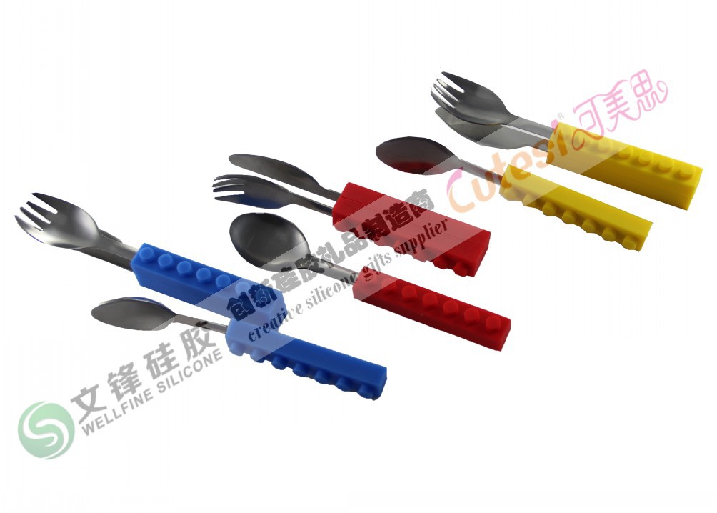 产品说明: 创意乐高积木设计刀叉勺餐具, 100%食品级硅胶材料和304#高质量不锈钢打造,符合美国FDA和欧盟LFGB标准, 无毒, 无味,环保安全.