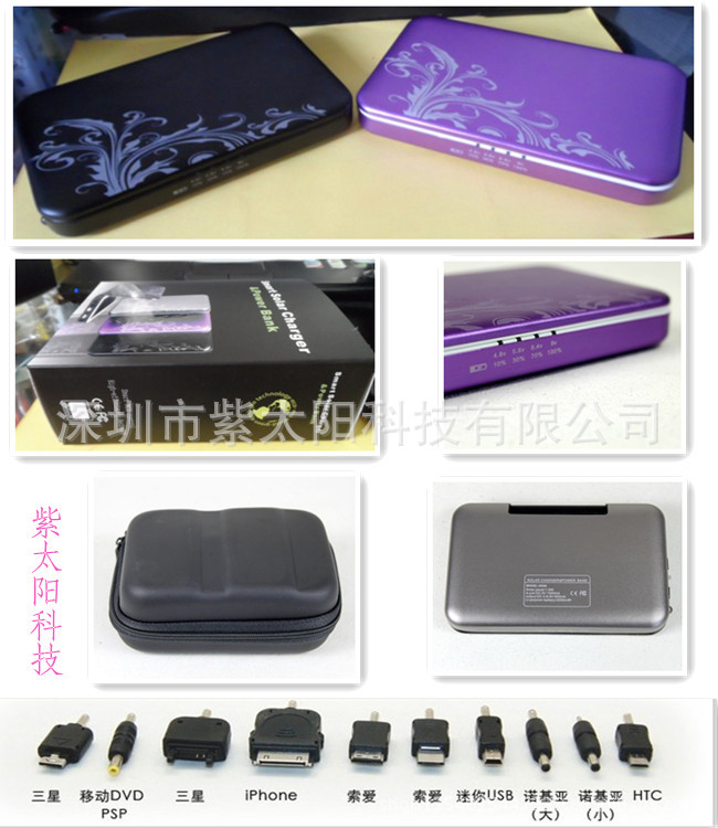 5.标配10个转接头,可适应各种数码产品的高效充电,Iphone 一个小时即可充满,可充IPAD平板电脑等.