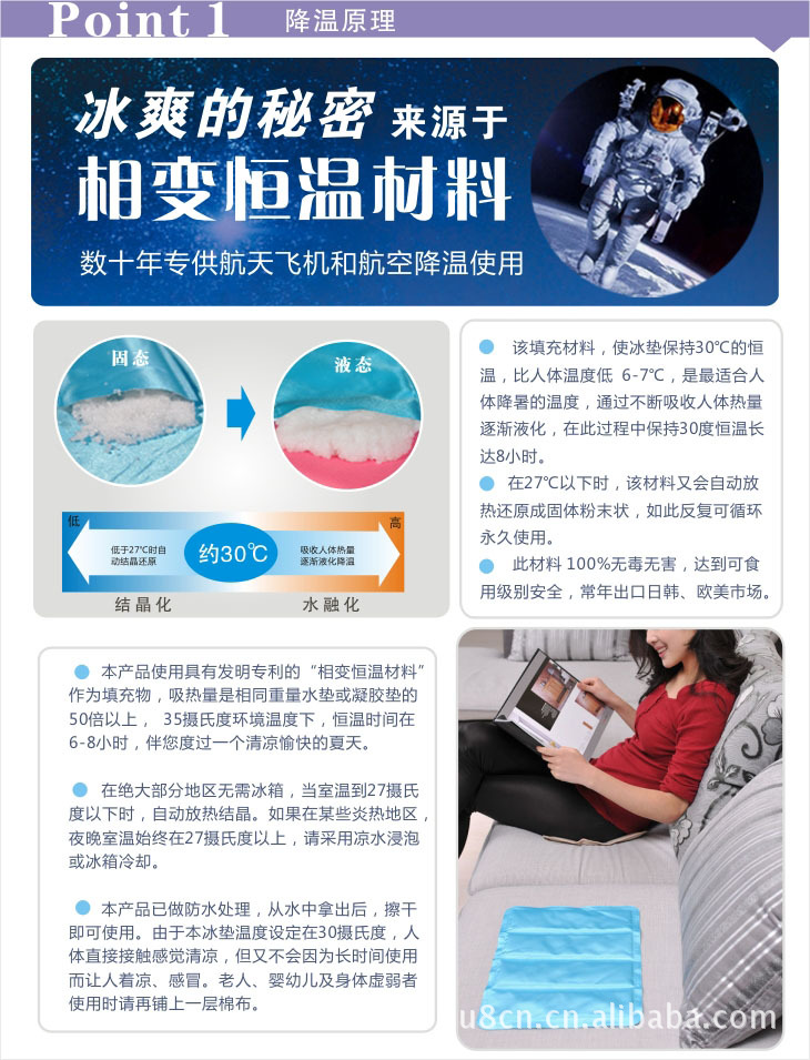 我们自行研制并成功应用于工业化生产的“优爽”冰垫及其系列产品,是采用国内最先进的物理相变原理及全自动无菌灌装,整个生产过程全为纯物理过程,不添加任何化学成分,确保产品的安全性;产品具有防暑降温,保健养生功能,是人们夏季降温保健的首选产品。“优爽”冰垫及其系列产品质量优良,做工精细,降温独特,被消费者誉为“绿色节能小空调”。