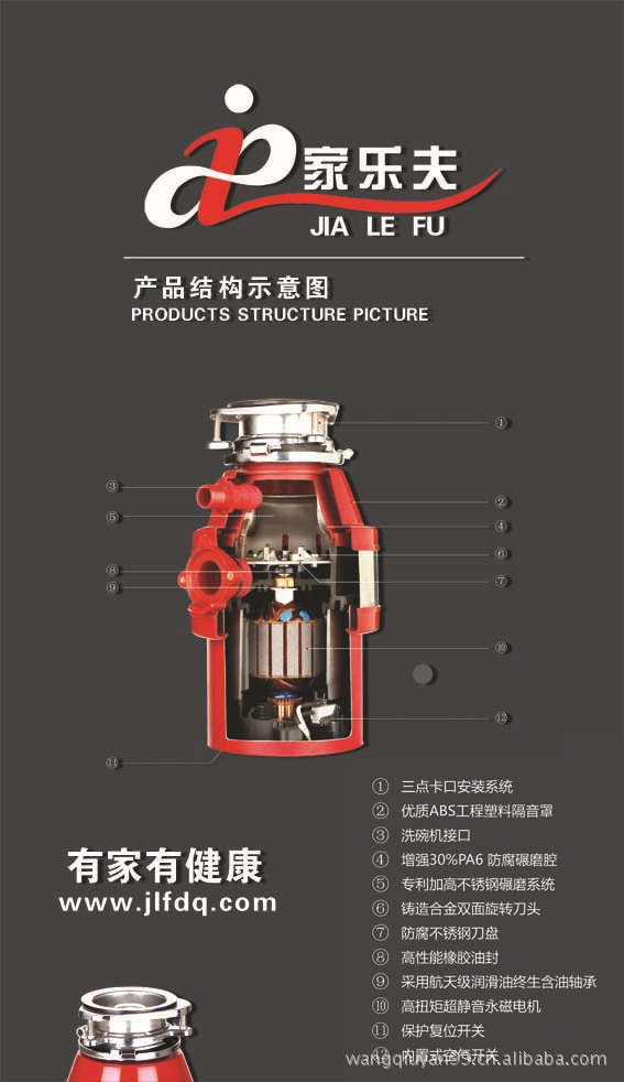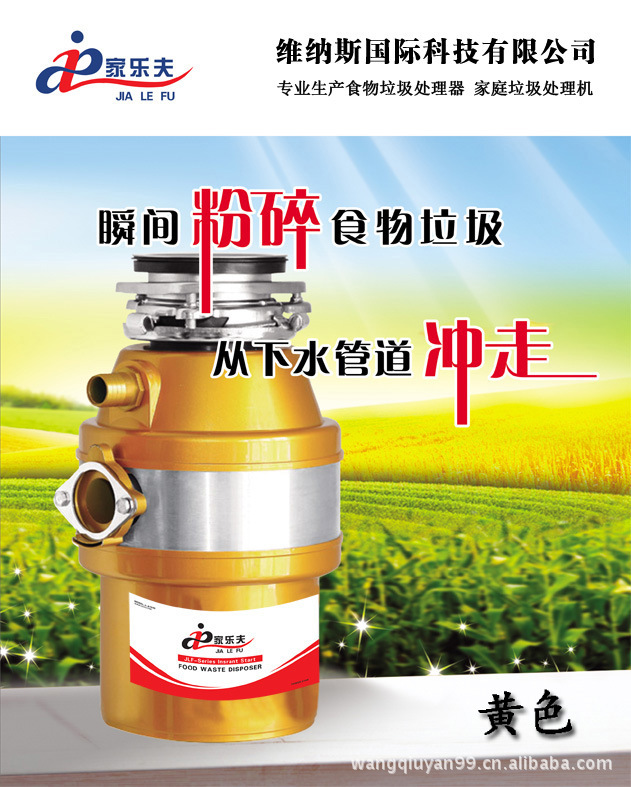 一种新型环保厨房电器,主要用于食物垃圾的粉碎处理,安装于厨房洗菜盆的排水口处,通过小型直流或交流电机驱动二级研磨或三级研磨刀盘,利用离心力将粉碎腔内的食物垃圾进行多次粉碎后排入下水道。产品只可以粉碎残羹剩饭、肉鱼骨刺、蔬菜梗叶、瓜皮果壳、蛋壳、茶叶渣、小块玉米棒芯、禽畜小骨等有机垃圾。