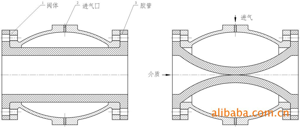阀门打开时,阀内截面的直径和连接管道的直径相同。传输压缩空气或流体时,空气或流体在压力下通过进气孔进入阀体内部,内部柔性胶管将变形成为将阀门通道完全封闭的形式。