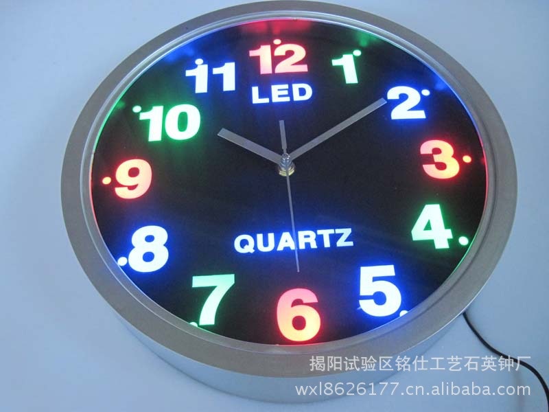 广东揭阳铭仕工艺石英挂钟时钟厂,专业生产LED发光石英挂钟.相框石英挂钟;动感佛光画石英钟,动感琉水画石英钟,台式鱼缸石英钟,灯光画石英钟,硅胶工艺卡通夜光石英挂壁钟,自己设计很多款式开模具生产的。我厂的产品造形新款独特,外表美观,质量有保证,为创铭仕产品品牌我们做好质量,为开拓市场,我们薄利多销,让利给批发商,欢迎观临惠购!