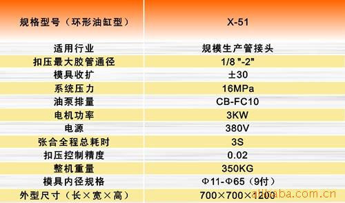 X-51型扣母机结构新颖独特,模具只作径向位移,锁母时定位精确,保证扣压成品率100%,且扣压速度快,适合大规模生产管接头的需要。 无锡市珠峰液压设备厂(原无锡市长安珠峰模具厂)是专业制造自动扣管机等系列胶管总成扣押设备的生产厂家。公司秉承“人才为本,科技兴业,严细管理,追求卓越”的宗旨,不断开拓进取、锐意创新,吸取国际先进技术,自主开发出系列胶管扣压机、切管机、装管机、剥胶机、清洗机、试压机、螺母扣压机等。产品广泛用于航空航天、军工生产、工程机械、煤矿采掘、钢铁、船舶制造、油田、液压机械、软轴加工、农业机械等行业,产品畅销全国各地,并远销海外市场,受到广泛好评和赞誉。