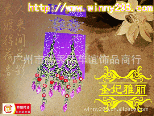 圣谊饰品贸易商行推出以古典和时尚合并为元素的品牌圣妃雅丽古典耳环,它传递着来自古时的讯息,续写着古为今用的古典首饰。耳环制作过程全纯手工制作,原创设计,既有民族、传统特色,也有异域、潮流时尚风格的耳环,客服咨询QQ:1067546548 业务QQ:826254324