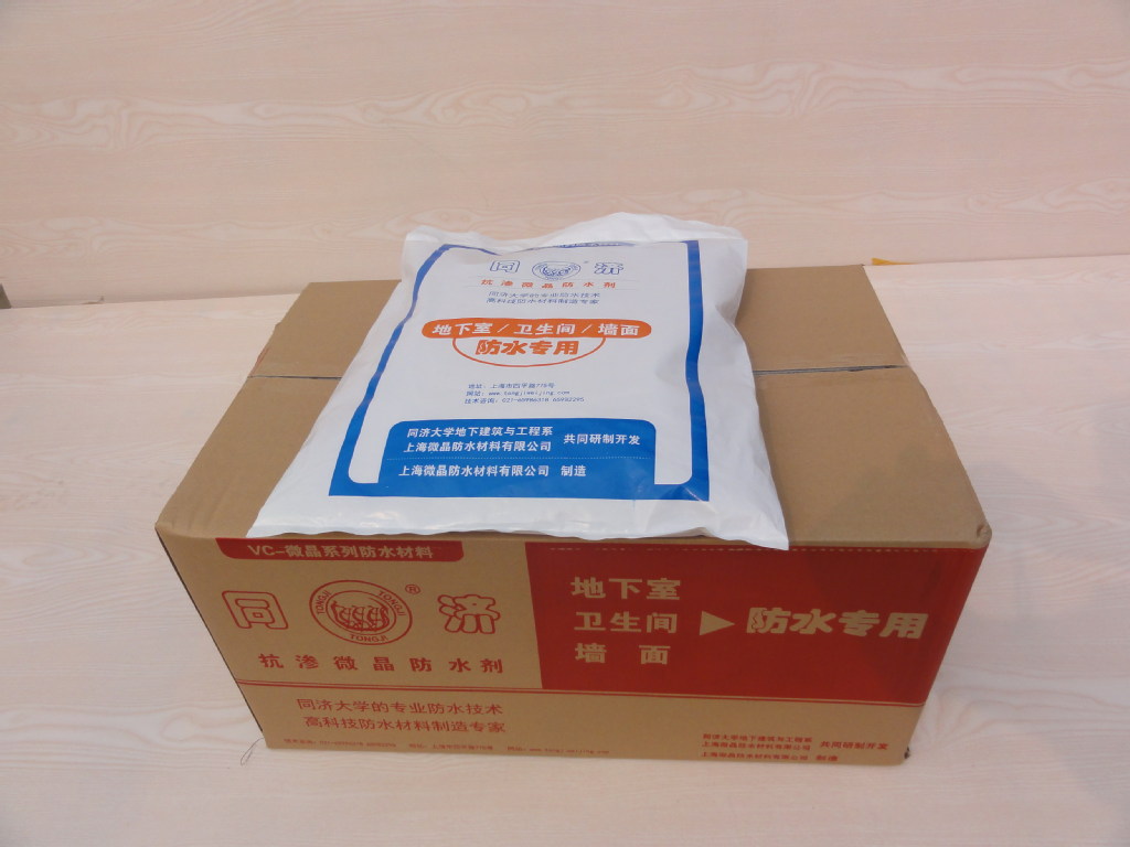 上海微晶防水材料有限公司是一家专业生产同济牌抗渗微晶防水剂的高科技企业。1999年公司和同济大学土木工程学院地下建筑与工程系共同研制开发了抗渗微晶防水剂,该产品技术先进,质量可靠,填补了国内砂浆和混凝土自防水的空白。经过10多年实际应用,产品性能稳定,抗渗效果显著。抗渗微晶防水剂的开发成功,使我国的刚性防水材料有了一个新的突破,创造了良好的社会效益,也体现了一种同济人的精神。抗渗微晶防水剂适用范围一、多层商品住宅东西山墙防水,高层商品住宅外墙防水;二、公共建筑(特别高层建筑)如银行、法院、财税、电力、通信、广电等办公综合楼外墙防水。三、小别墅墙面、现浇斜屋面防水;四、刚性屋面防水、现浇平屋面刚性防水;五、地下室、电梯基坑防水、抗渗;六、人防工程防水、抗渗;七、铁路、公路隧道防水、抗渗;八、游泳池、水池、污水池防水、抗渗;九、家庭装潢卫生间墙地面防水、底层地面防潮。