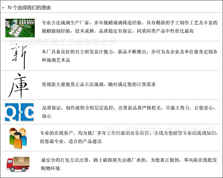 昆山汉风琉璃工艺品有限公司,是一家集设计研发,生产,销售为一体的古法琉璃工艺品专业厂家,本厂生产古法琉璃工艺品多年,具有精湛的手工制作工艺及丰富的脱蜡烧制经验,作品新颖独特,造型完美,做工精细,色彩鲜明,通透性极佳,在琉璃行业颇受好评。