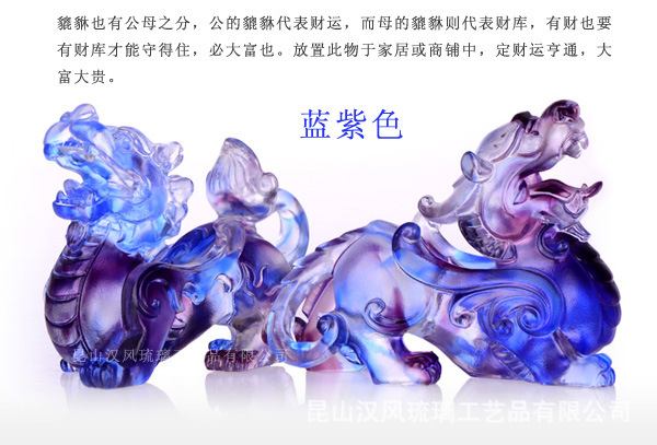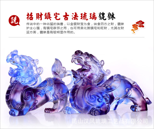 昆山汉风琉璃工艺品有限公司,是一家集设计研发,生产,销售为一体的古法琉璃工艺品专业厂家,本厂生产古法琉璃工艺品多年,具有精湛的手工制作工艺及丰富的脱蜡烧制经验,作品新颖独特,造型完美,做工精细,色彩鲜明,通透性极佳,在琉璃行业颇受好评。