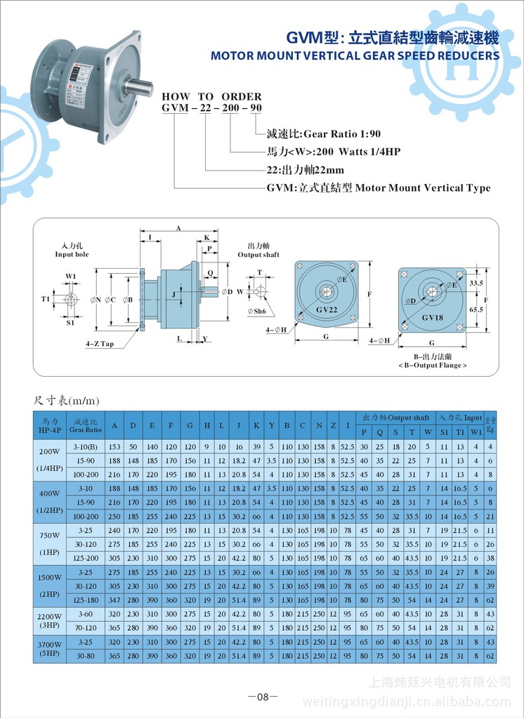 东炜庭立式直结型齿轮减速机(TYPE-GVM-28)、东炜庭电机、东炜庭齿轮减速电机、台湾东炜庭齿轮减速马达采用电机作为动力的来源,减速机集斜齿轮传动之精萃,堪称台湾精品,可与任何品牌之台湾同类产品相媲美。可根据客户设计需要生产卧式,立式,双轴型,直结型供选择,也有降框型,特殊产品可以定制;◆与电磁刹车组合成刹车减速马达;◆变频专用减速马达,满足电机低频运行安全保障;◆直结或联轴型齿轮减速机,可与任何IEC标准感应、变频、刹车马达匹配;◆按客户要求定制的其它特殊规格之减速马达.特点:体积小重量轻无噪音免保养.马力:1/10HP-5HP. 隶属于台湾东炜庭电机工业有限公司的 “上海炜廷兴电机有限公司”应国内市场的需求,于1999年在上海成立分公司,上海分公司业务部电话:021-64792329 13501917626