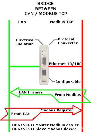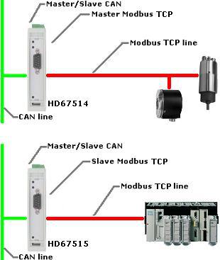网关HD67514和HD67514-B2是TCP客户端的从机,所以他们允许CAN设备和Modbus TCP服务器之间有接口,反之亦然。