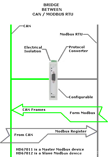 网关HD67012是RTU / ASCII/ JBUS的从机,所以它允许CAN设备和Modbus主机之间有接口