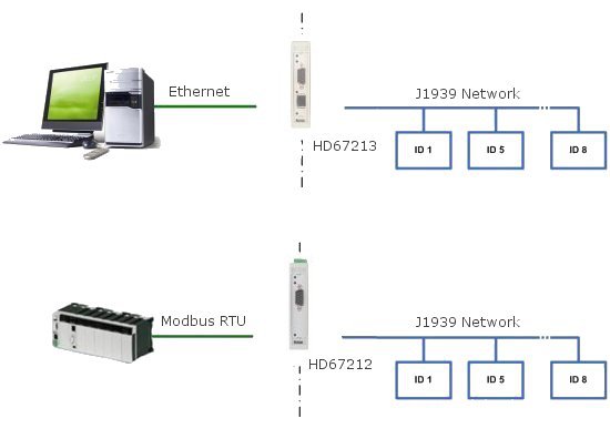 HD67212 | Gateway J1939 from/to Modbus RTU | 120x23x107 | -30° to +70° |