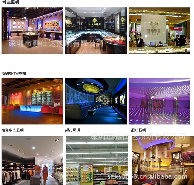 公司經過多年的發展,其主要產品包括:LED光條系列,全系列LED 日光燈管,LED節能燈飾系列,其中LED節能燈飾產品主要包括:LED筒燈,LED壁燈,LED 床頭燈,LED鏡前燈,LED吸頂燈,Led 投光燈,LED 櫥櫃燈,LED貨架燈,LED洗牆燈,LED 廣告燈等一系列LED照明產品。公司產品主要應用於以下領域及場所:城市亮化、室內外裝飾、廣告工程、工商業照明、家居照明、舞臺燈光工程、酒店娛樂場所照明及裝飾等。目前公司產品已成功應用於以下工程項目: 深圳地鐵、廣州火車站、北京電視臺、中國工商銀行、中國石化、WAL-MART、宜家家居等。