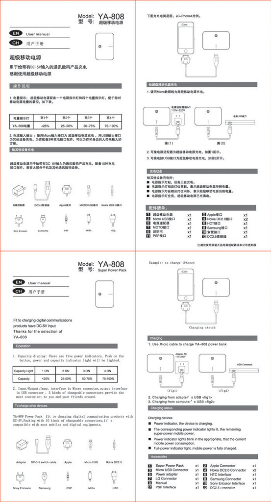 l双USB输出接口,即插即用,采用USB端口供电输出,插上数据线即可实现随身、随时充电,超值共享,无须携带各种充电器,随机附赠的八个转接头能为各品牌智慧型手机平板电脑等多种数码产品提供充电或供电,解决了数码产品电池电量不足的难题.