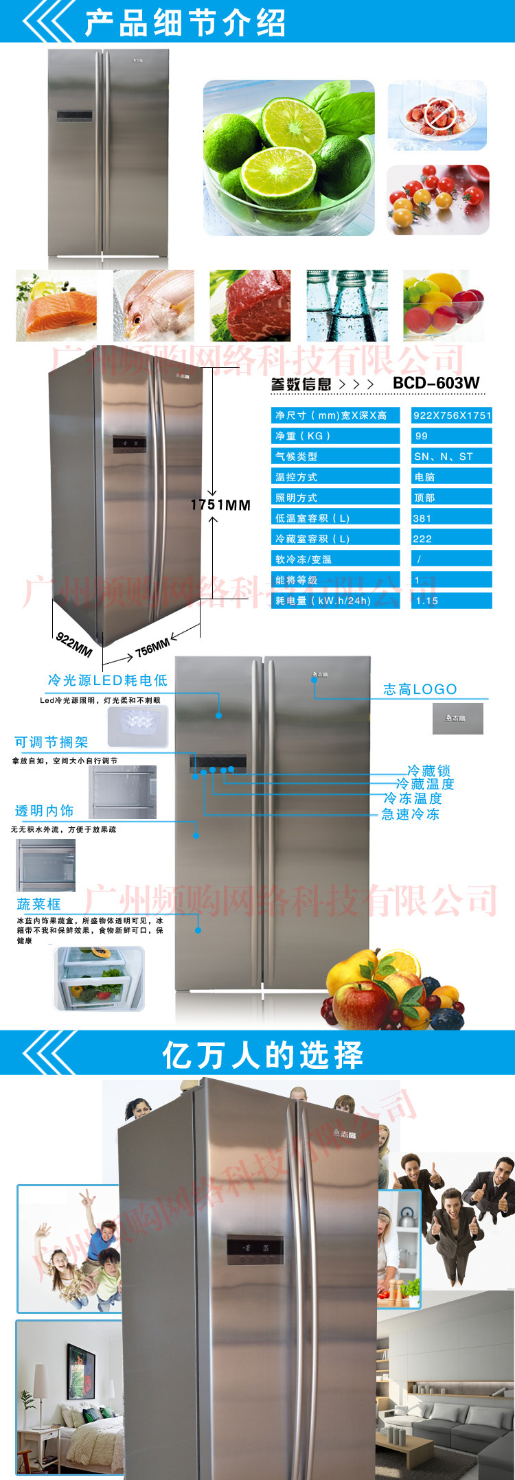 志高冰箱BCD-603W无霜对开门保修十二年智能电脑控温智能特价批发
