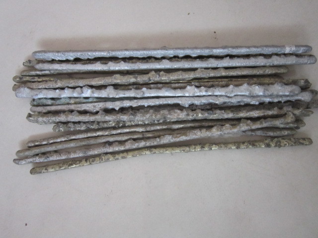 (6)堆焊硬质合金焊层。在打底合金层上面,用YD型焊条堆焊,使用中性焰(可稍偏碳化焰)焊咀均匀平稳的在工件表面上移动,火焰对着合金焊条加热(注意不可使焰心尖端接触合金颗粒),使焊条中胎体合金熔化,随之硬质合金颗粒也一同落下。在熔化的胎体金属凝固之前,要把颗粒安排好,可用左手拿着的合金焊条拔弄,或另一人手持一根打底焊条或石墨棒作拔棍,在一傍迅速拨弄颗粒,使之排列均匀整齐。堆焊层厚度按设计要求控制。