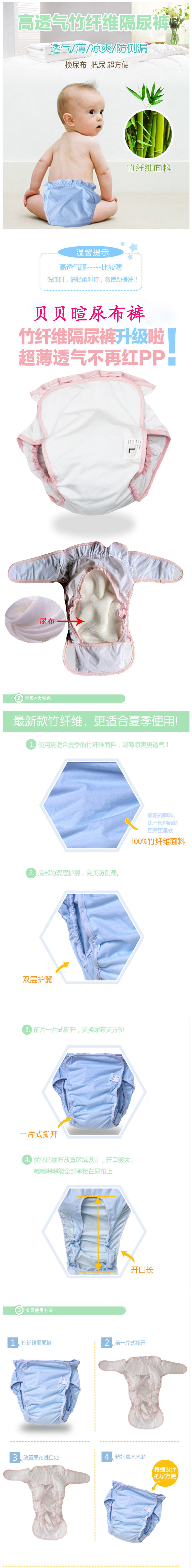 特点:本产品根据婴儿生长发育特点,结合人体工学原理精心制作而成。在设计中采用大尺度婴童专用魔术贴单片,这样腰围可随意调节,松紧自如。而且易拆易换,更好的方便妈咪更换尿布。尿裤的布料是针对婴儿特点选取,采用天然竹纤维材质,手感舒服,具有超强的透气性,并可手洗多次,宝宝穿着更加舒适。有了这款竹纤维尿裤,妈妈们不再担心纸尿裤带给宝宝的不透气啦!