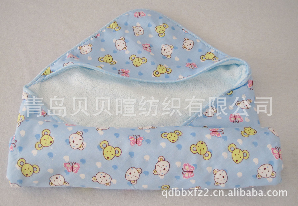 渐渐的进入秋季,空气越来越凉,为了方便带宝宝外出,宝妈不妨为宝宝购置几件婴儿包被。此款婴儿包被外面采用纯棉印花平纹布,里面采用竹棉混织经编竹纤维毛圈布,边缘使用顺色纯棉印花布包边,整体成正方形设计,其中一角有三角形婴儿帽子设计,人性美观实用。