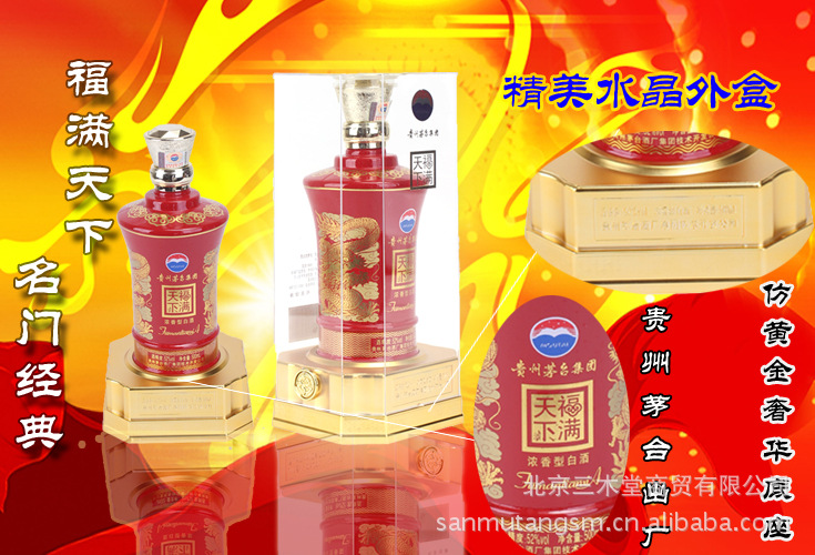 茅台福满天下系列礼盒酒是茅台集团技术开发公司出品的浓香型精致礼品酒系列,其酒质晶亮透明,敞杯不饮,香气扑鼻,开怀畅饮,满口生香,饮后空杯,留香更大,持久不散。口味幽雅细腻,酒体丰满醇厚,回味悠长。同时茅台技术开发公司针对企业和个人用户在商务社交活动中的需求,加入了多种精美工艺,使福满天下系列酒更加精致华丽.为馈赠亲朋好友、商务伙伴之佳品!