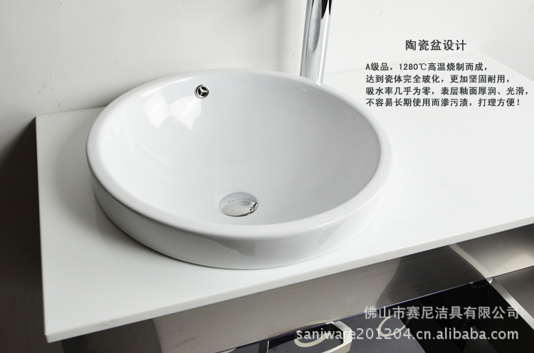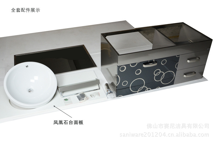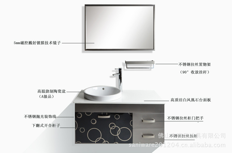产品配置:不绣钢主柜,陶瓷盆,置物架,镜子,安装配件 。