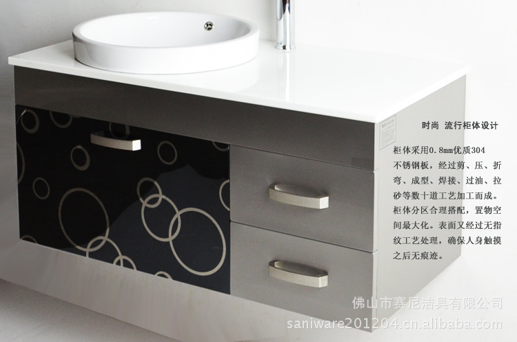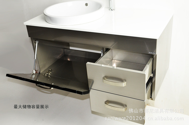您选择我们全不锈钢浴室柜的理由:(1)就产品材质优势而言:柜体采用全不锈钢板,经数十道工艺精制而成,我们可以大言不愧说一句:我们的产品100%防水,防锈,坚固耐用,不开裂,不变形,正常使用100年(做为朋友我们还是建议您时代进步,您生活水平的提高,您当然不会满足于现在的卫浴,我们在您需要更换的时候将为您提供更完美更漂亮更时尚的卫浴)。(2)就价格而言,我们的这款产品并不会比实木浴室柜贵,但它的耐用性是其它浴室柜无法相比的。