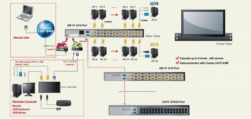 ●支持各种操作系统,从一组USB键盘、USB鼠标和一个显示器来处理多样平台PC,MAC ``G3/G4,iMAC .