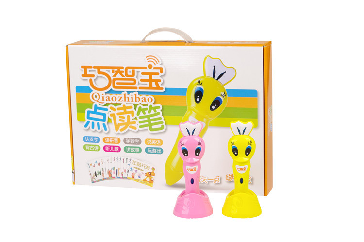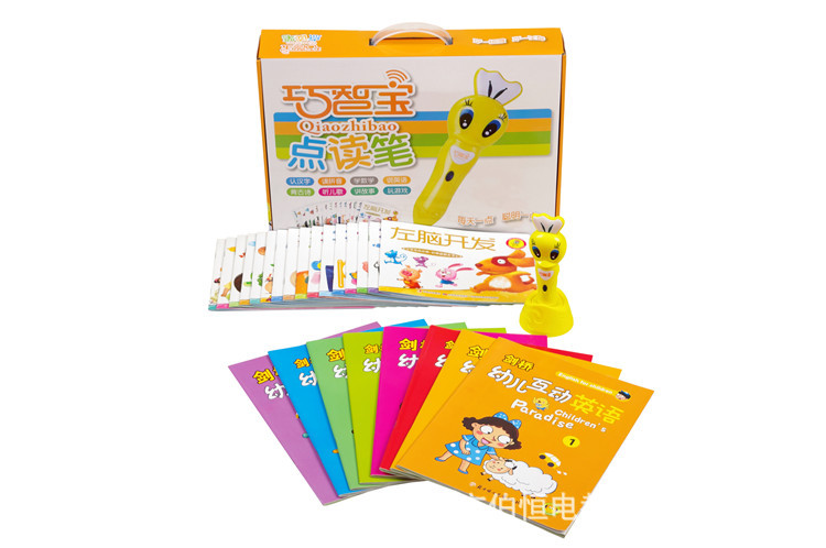 巧智宝点读笔功能特点点读功能 在配套图书点不同位置可发出不同的声音,点中文说中文,点英语说英语,点故事讲故事,点儿歌唱儿歌,笔头采用优质第三代加密型OID技术方案,感应灵敏、准确,哪里不懂点哪里。录音播放 巧智宝读笔通过特定的录音功能实现:录音、跟读、播放试听等。MP3音乐 巧智宝点读笔支持MP3播放功能,标准音播放时间可长达2小时,USB高速随心下载儿歌、童谣、故事等,充分刺激孩子的听觉,从小挖掘孩子潜能。益智游戏 通过语音反馈的游戏设定,把练习变成游戏,大大提高学习兴趣,有趣的互动游戏可增强孩子的自信心,迅速开发智力。趣味阅读 巧智宝点读笔操作简易,点击即可实现趣味阅读功能,从学前认字识物,汉语拼音,算术、听故事到国学、唐诗及英语阅读等,给孩子一个全面早教的学习氛围。双喇叭高清发音 巧智宝点读笔采用了真人原声发音,高音质双喇叭,保证高清晰音质,为孩子提供良好的语言学习语境,帮助孩子从小培养正确的发音,养成良好的语感,让孩子有一口标准流利的普通话。有声图书 诸多权威儿童教育专家精心设计,联合正规知名出版社,出版发行,多达500多本海量图书可供选择。海量存储 巧智宝点读笔配置4GB内存,可容纳上百本图书,通过USB高速下载海量图书配套语音。软件升级服务 巧智宝点读笔不断进行软件优化及升级,用户可以通过公司网站免费在线升级享用最新科技成果。安全环保 巧智宝点读笔无毒无味,内置锂离子电池,安全、高效、环保、内置笔头,无外置易脱零件,外型圆滑,完全符合儿童的人体工学特点,外壳使用环保的ABS及抗紫外线材料做成,所发声音为机械波,音量可自动调节,严格控制在孩子的正常视听范围。