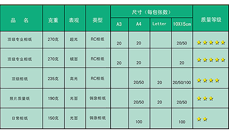 RC防水相纸的纸基是在专门制造的相片原纸两面作了PE淋膜,提高了照片纸的挺度和防水性能;而其涂层是纳米级的防水涂层,不但亮度高、防水性能好、而且颜料、染料墨水兼容,打印品质极高,一般用于高品质的照片打印。 铸涂相纸纸基未做防水处理,所以比RC防水相纸的防水性能差,并且在亮度、图像品质方面比RC相纸要差一些。