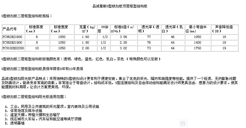 pc浪板(FRP)是以工程塑料聚碳酸酯(PC)为主要原料,并加入抗紫外线剂UV和其它化工原料采用当今最的技术制成。产品具有优良的安定性、不易黄化、不易变质,在紫外线光谱范围(290-400NM)内具有高度吸收紫外线能力。并且经试验证明高达99.9%的紫外线均可有效隔绝。 主要用途: 应用于园林、农用温室及室内养鱼大棚:天窗、地窖、拱圆型屋顶及商用大棚;现代火车站、航空港等候车厅及通道顶棚;现代汽车站轮渡码头等公共设施的遮盖:厂房、仓库、市场等领域采光。 标准厚度(mm) | 波形 | 型号 | 0.8 | 中波 梯形波 | Z930-79-16 T840-210-26 T820-205-28 T900-225-15 | 1.0 | 1.2 | 1.5 | 1.2 | 角驰111-760 | T760-380-76 | 1.8 | 1.2 | 梯形波 | T950-237-35 T960-320- |