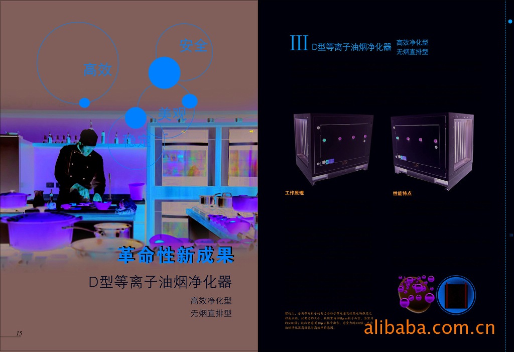 低温等离子:主要采用辉光放电、微波放电、电晕放电等方法产生高浓度离子。等离子体是一种聚集态物质,其所拥有的高能电子同油烟中的分子碰撞时会发生一系列基元物化反应,并在反应过程中产生多种活性自由基和生态氧,即臭氧分解而产生的原子氧。活性自由基可以有效地破坏各种病毒、细菌中的核酸,蛋白质,使其不能进行正常的代谢和生物合成,从而致其死亡;而生态氧能迅速将油烟分子异味气体分解或还原为低分子无害物质;另外,借助等离子体中的离子与物体的凝并作用,可以对小至亚微米级的细微油烟颗粒物进行有效的收集。