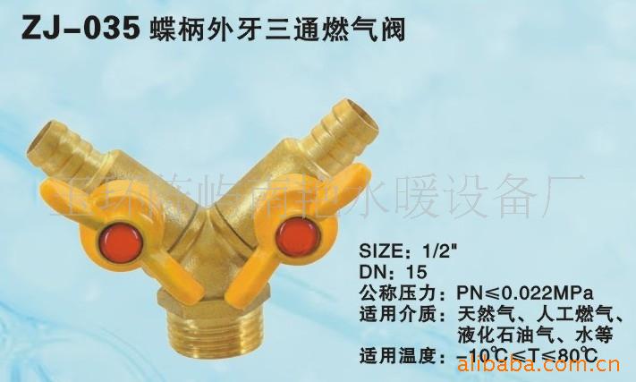 ZJ-035 蝶柄外牙三通燃气阀SIZE:1/2"DN:15公称压力:PN≤0.022MPa适用介质:天然气、人工燃气、液化石油气、水等适用温度:-10℃≤T≤80℃