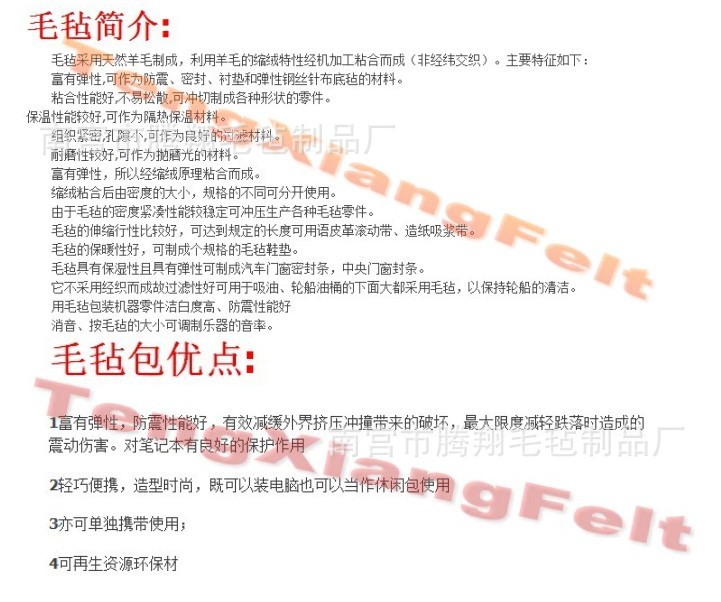 专业生产各种羊毛毡、化纤毡、针刺毡、工业毡、民用毡、抛光毡、吸油毡、阻燃毡、彩色毡、书画毡、毛毡包、毛毡杯垫、毛毡挂饰、毛毡画、毛毡绳、毛毡条、毛毡筒等各种毛毡工艺制品。可根据客户要求加工定做各种型号毛毡零件。
