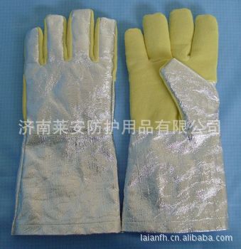 铝箔芳纶耐高温手套手掌为杜邦KEVLAR®面料,手背和手腕为铝箔防火面料; 具有良好的耐高温、防辐射热性能,手心耐高温500℃;手背防辐射热1000℃,能够反射95%的热量。应用于钢铁制造、冶金及锻造行业等。