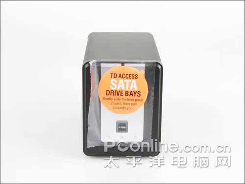 D-LINK DNS-323的机身为10.2×12.8×19.8厘米,放置在办公桌上也不会占据太多空间。机身采用黑色和银色作搭配,形成鲜明的对比。D-LINK DNS-323前面板有一个电源按键,方便控制设备开关。还有两个硬盘灯,通过硬盘灯可以清晰显示硬盘的工作状态.