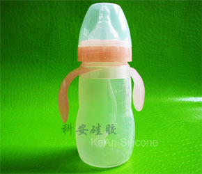 宝贝描述:整个奶瓶的瓶身(除壶柄)和奶嘴都是采用食品级液体硅胶制成,软软瓶身,防胀气