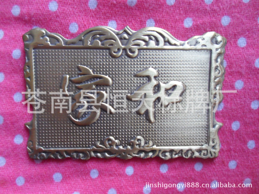 苍南县恒天标牌厂 本厂可按客户需要订做产品,满足各层次的需求。为你专业定制各种广告,促销工艺品;专业生产各类徽章、纪念章、旅游纪念品、标牌、铭牌、钥匙扣、袖扣、奖牌、奖章、贵宾金(银)卡、工号牌、不锈钢制品、挂饰、开瓶器等金属塑料工艺品。
