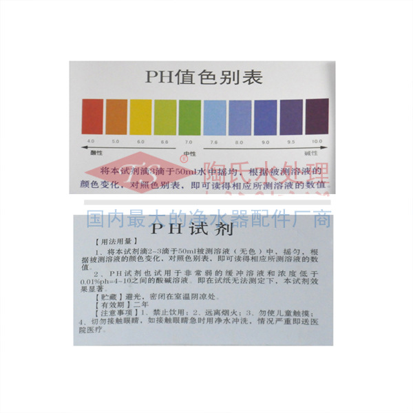 本试剂克服了传统的对酸碱检测方法的缺点。极大地简化了操作,降低了检测成本,效果显著,数据可靠。本所研制生产的PH试剂系采用进口原药、最新工艺配方,经多年反复试验,应用在产品的碱酸性的测试上,一目了然,并附配套的色别表。 产品特点:精确度高,易于操作,价格低廉,携带方便。(10ML/瓶的包装可用150次左右,而PH试纸则小于90张次) 应用范围:可测任何PH值在4——10之间的无色酸碱溶液,用本品检测均可呈现色别表上相应的色泽反应。 精确度:可检测非常弱的缓冲溶液(≥0。005%)或及浓度过低(≥0。005%)的酸碱溶液。 包装、贮存期:10ML/瓶精装含量99%保质期3年。 用法:将本试剂滴3—4滴于50ML被测溶液中摇匀,也可以根据需要减半量被测溶液,滴1—2滴试剂,根据显示的颜色与色别卡对照,即可读得相应溶液的PH值。 应用领域: 水产养殖、污水处理、实验室、锅炉制水、离子水、电力、造纸、制药、饮用水机、水杯、饮用水水质、教学演示等的检测工作。