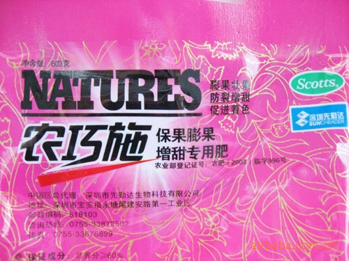 1.产品原料纯正,品质精良,全水溶全营养全吸收,并且不含人工激素,完全符合出口级无公害优质水果与蔬菜的生产要求。肥效快速并十分显著,特别适合各种水果和瓜菜叶面坐果后的追肥使用。合理使用可以有效提高坐果率,迅速实现果实膨大增产,同时有效提高果实品质,大大提高果实可溶性固形物含量及含糖量、美化着色效果。