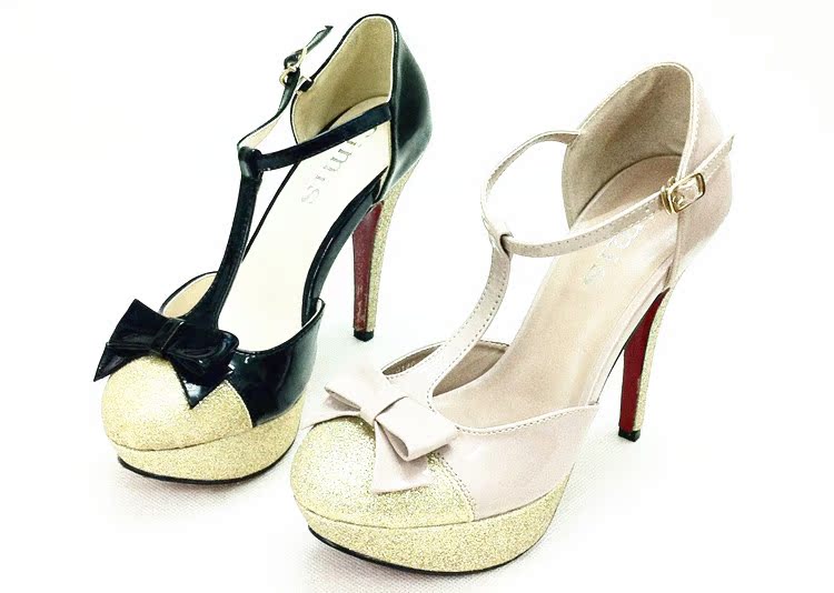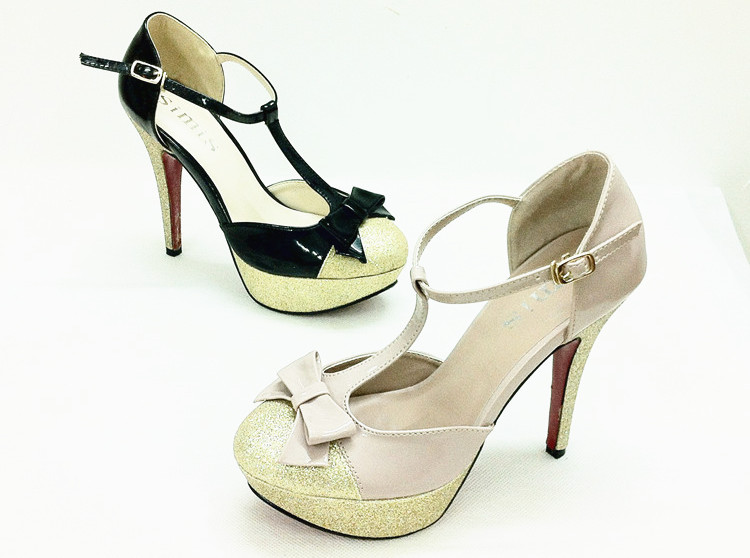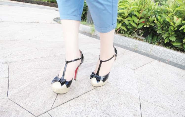 厂家直供超高跟防水台女鞋蝴蝶结中空单鞋T字开型拼色鞋子