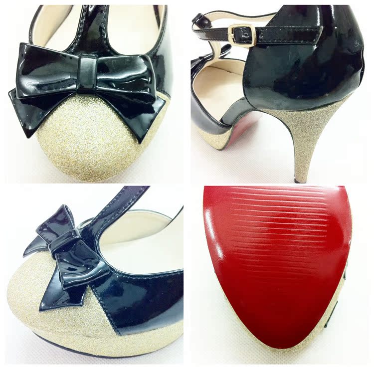 鞋厂直供外贸内销百搭配色拼色闪光料漆皮蝴蝶结鱼嘴鞋坡跟单鞋
