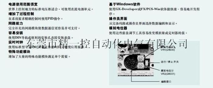 | | 在所有的FX1NPLC中都有实时时钟标准。时间设置和比较指令易于操作。小时表功能对过程跟踪和机器维护提供了有价值的信息。 |